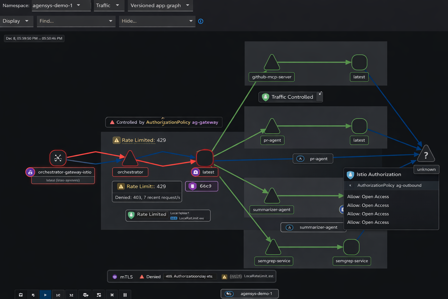 When we see unexpected paths, it usually means we’re missing AuthorizationPolicy rules, have misconfigured ServiceEntries, or incomplete waypoint coverage.