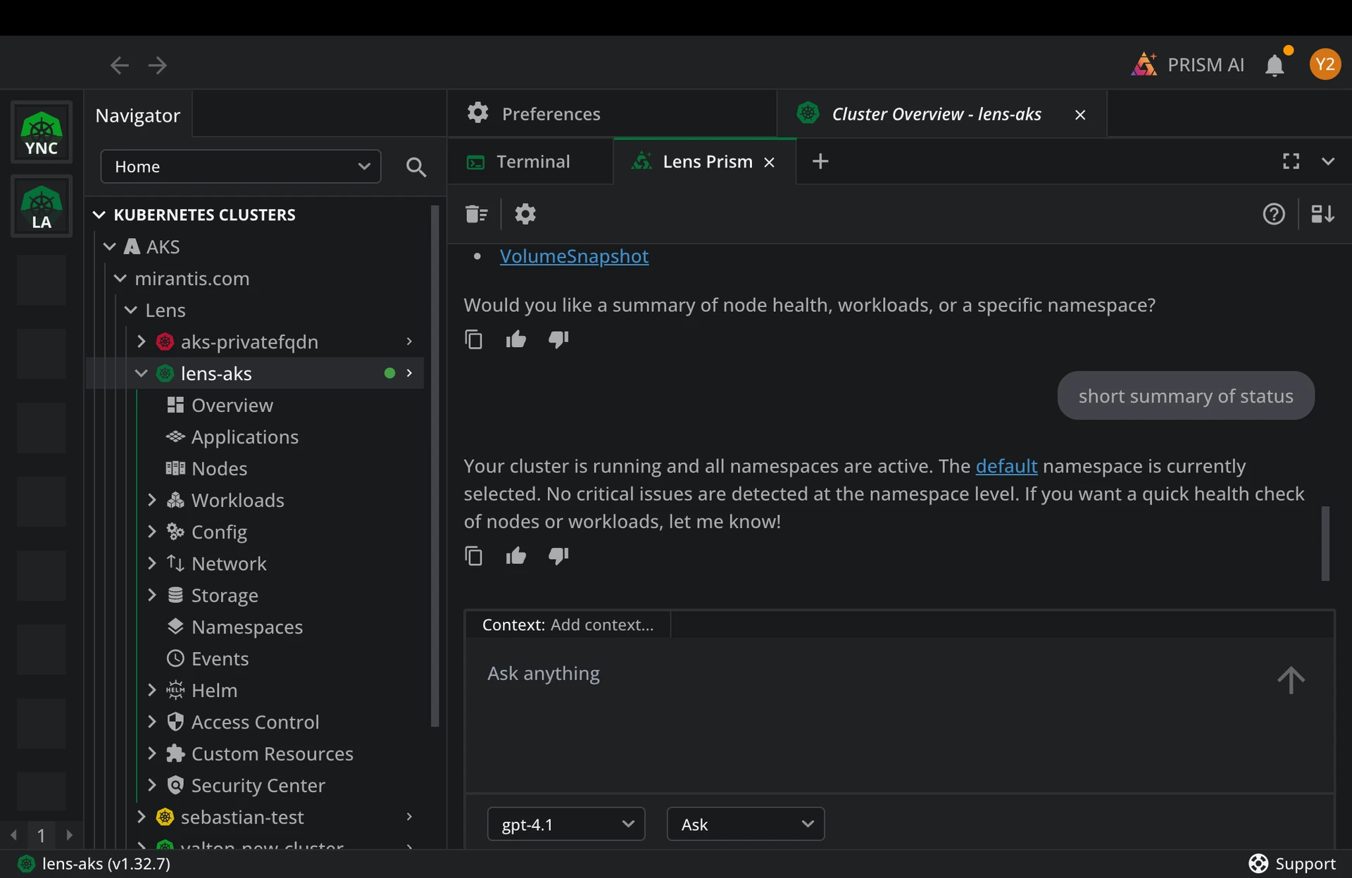 The image below illustrates Lens IDE AI (Prism AI) running a full cluster assessment from a single natural language prompt, “summarize the status of the cluster,” giving cloud platform teams a faster way to troubleshoot and operate Kubernetes without relying on many kubectl commands.